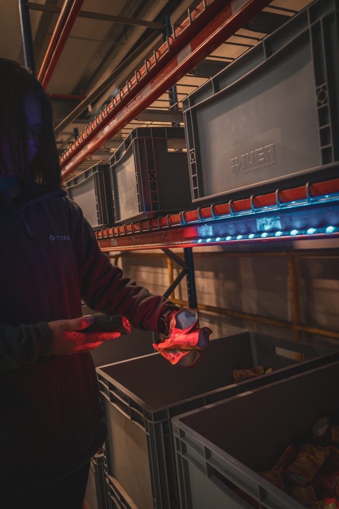 Le Pick to Light repose sur un guidage lumineux intelligent. Concrètement, des rubans LED installés sur les étagères orientent l’opérateur directement vers la bonne zone de prélèvement.